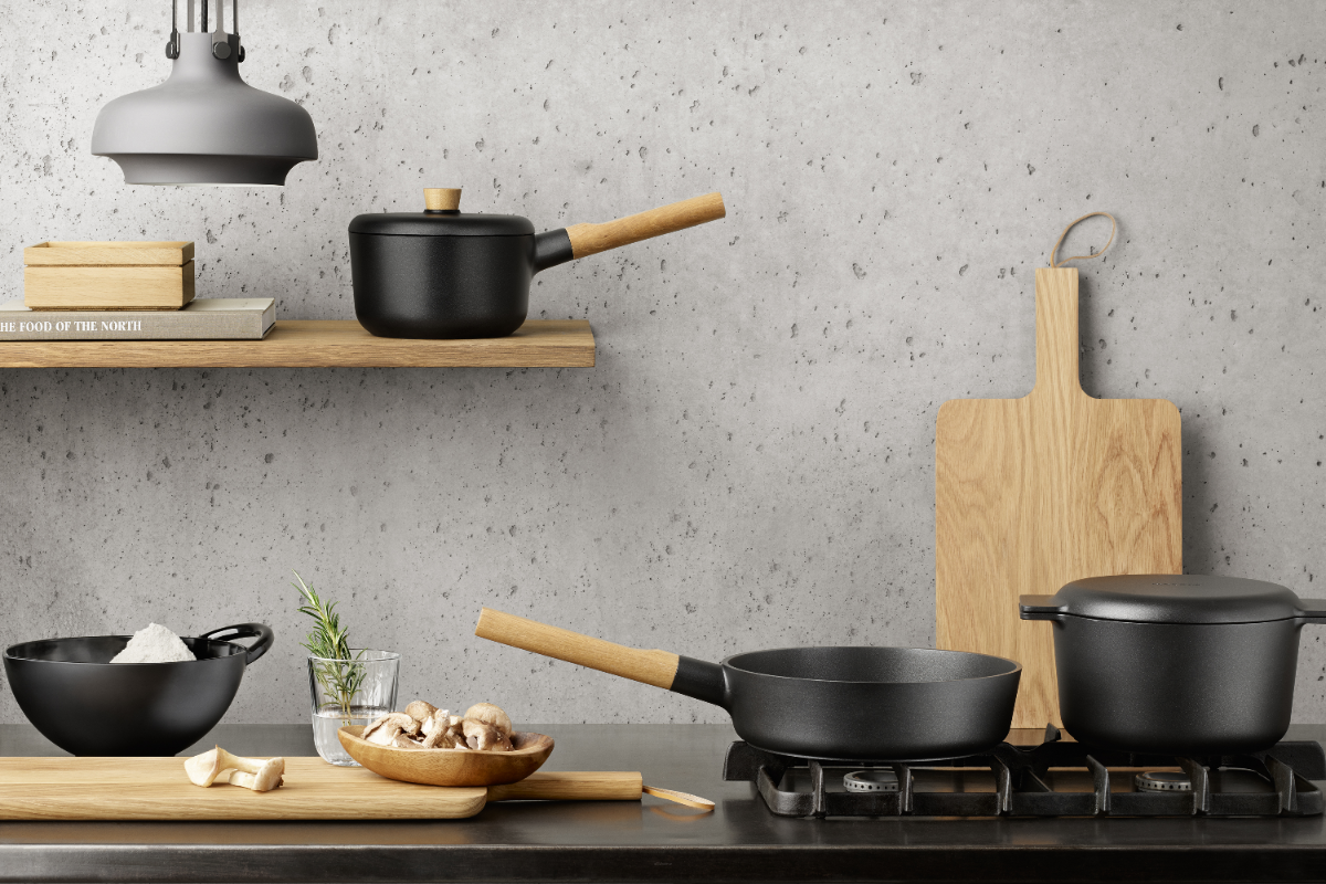 - pots and pans from the Nordic Kitchen collection - distinguished by black or silver color and wooden handles, part of a larger kitchen and table collection