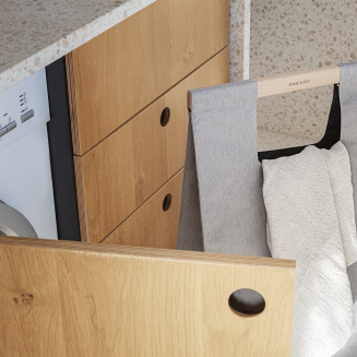 Kosz na pranie Eva Solo to praktyczne rozwiązanie, które łączy nowoczesny design i wygodę użytkowania. Wyposażony w uchwyty z drewna bukowego z magnesami, zapewnia łatwe przenoszenie oraz skuteczne zamykanie. Konstrukcja sprawia, że kosz stoi stabilnie, nie zapada się, a wnętrze pozostaje uporządkowane.