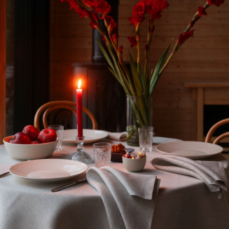 Aamu, czyli „poranek” po fińsku, to serweta stworzona z myślą o codziennych rytuałach. Uszyta w 100% z certyfikowanego lnu Masters of Linen, zmiękczonego i przyjemnego w dotyku. Minimalistyczna forma i jednolity kolor wprowadzają do wnętrza spokój, równowagę i skandynawską harmonię, doskonale komponując się z ceramiką, drewnem i naturalnymi materiałami. Wyprodukowana w Finlandii przez markę Lapuan Kankurit, która łączy tradycję rzemiosła z nowoczesnym podejściem do designu. Certyfikat Öko-Tex gwarantuje bezpieczeństwo użytkowania i przyjazność dla środowiska. Serweta Lapuan Kankurit Aamu to wybór dla tych, którzy szukają trwałych, ekologicznych i estetycznych dodatków do stołu, które służą latami i zawsze wpisuję się w aktualne trendy.