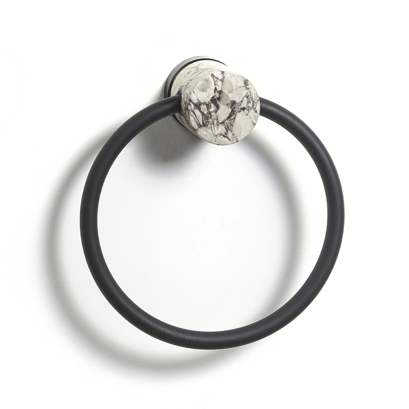 Uchwyt na ręcznik Nero belgijskiej marki Aquanova. Kolekcja akcesoriów łazienkowych Aquanova Nero to propozycja dla osób, które chcą dodać swoim wnętrzom modowego smaku i niepowtarzalnej atmosfery. Elementy kolekcji Nero wykonywane są ręcznie z naturalnego kamienia co gwarantuje ich indywidualny charakter oraz niepowtarzalny wzór. Wraz z produktem dostarczany jest zestaw montażowy.
